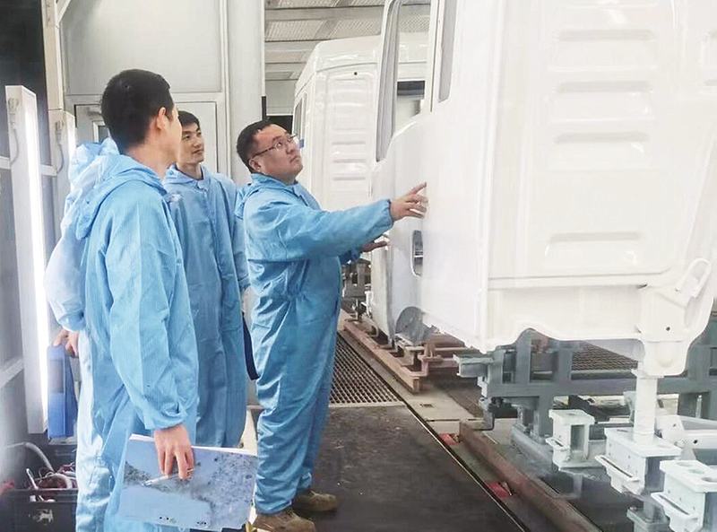 李一虎(右一)带领团队在车身厂涂装车间检查外观漆面