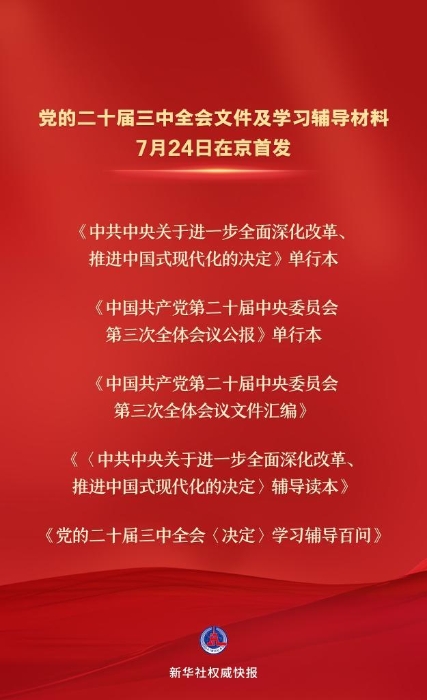 党的二十届三中全会文件及学习辅导材料7月24日在京首发
